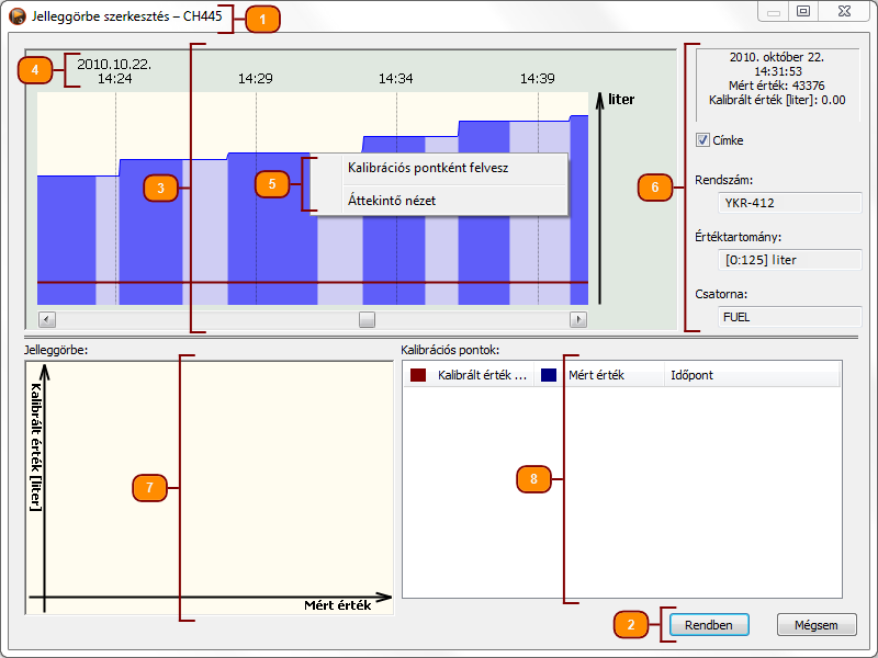 A kalibrációs pontok felvétele a Jelleggörbe szerkesztés dialóguson történik, mely a Jelleggörbék törzsadatkezelő panel Helyi menüjéből kiválasztott Kalibráció menüpont hatására jelenik meg a Méréskiválasztó dialóguson beállított időszakra vonatkozóan. Ez az időszak általában megegyezik a kalibrációs mérés elvégzésének napjával (ld. A kalibráció napja) – megfelelően elvégzett kalibrációs mérés esetén. Ennek hiányában ugyanakkor lehetőség van hosszabb időszak kiválasztására is, amikor több tankolás adatai szolgáltatják a kalibráció alapját.